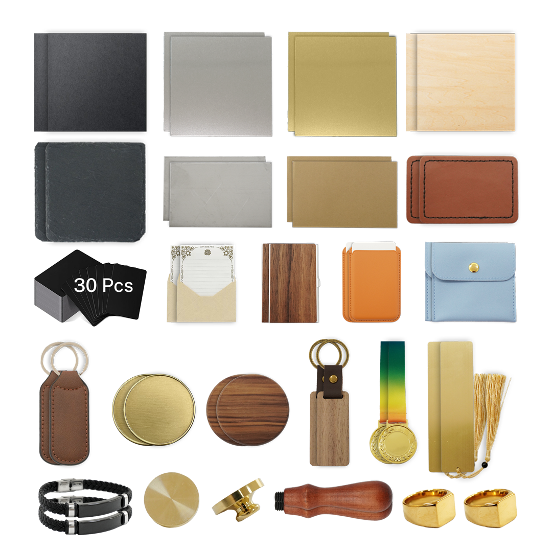 This versatile material kit includes a wide range of items to inspire your creativity: metal cards, stainless steel, aluminum, brass, leather tags, leather bags, wooden boards, wooden and metal coasters, metal bookmarks, medals, metal and leather card holders, brass rings, bracelets, and even a brass stamp.